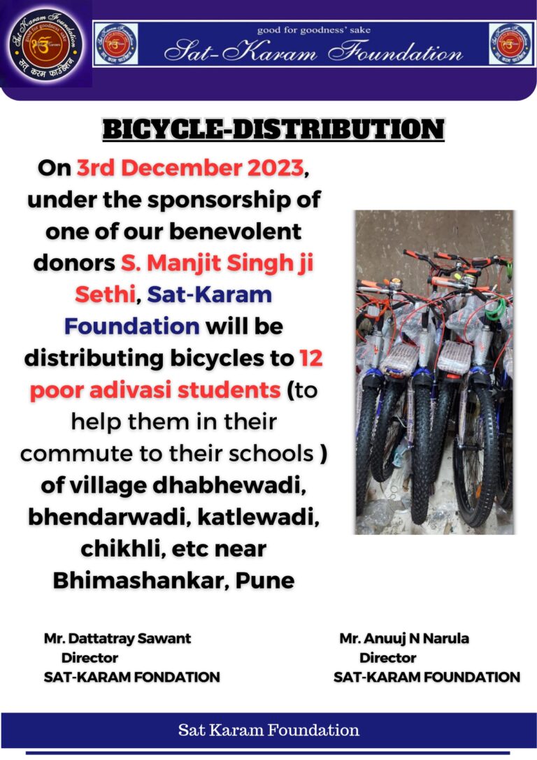 On 3rd December 2023, under the sponsorship of one of our benevolent donors S. Manjit Singh ji Sethi, Sat-Karam Foundation will be distributing bicycles to 12 poor adivasi students (to help them in their commute to their schools) of village dhabhewadi, bhendarwadi, katlewadi, chikhli, etc near Bhimashankar, Pune.