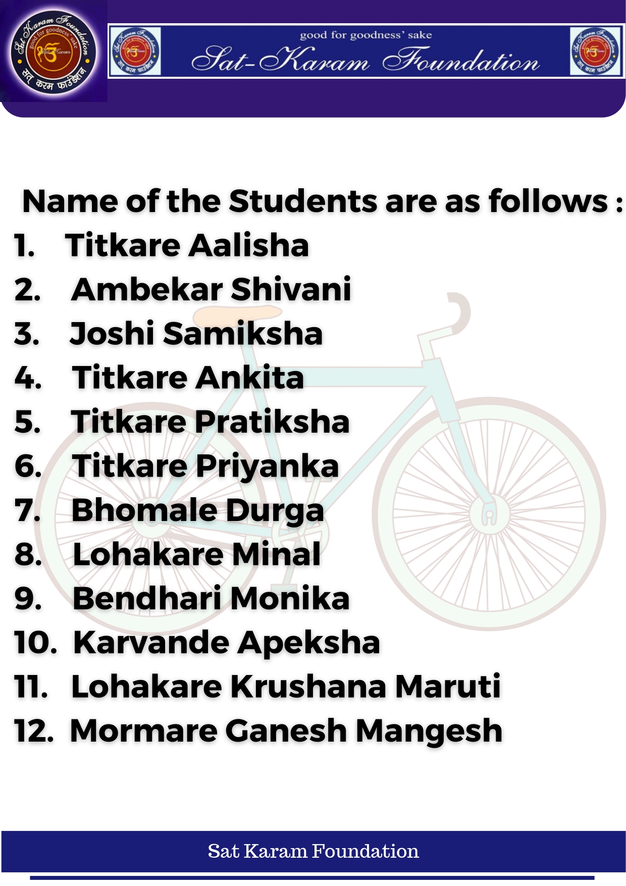 On 3rd December 2023, under the sponsorship of one of our benevolent donors S. Manjit Singh ji Sethi, Sat-Karam Foundation will be distributing bicycles to 12 poor adivasi students (to help them in their commute to their schools) of village dhabhewadi, bhendarwadi, katlewadi, chikhli, etc near Bhimashankar, Pune.