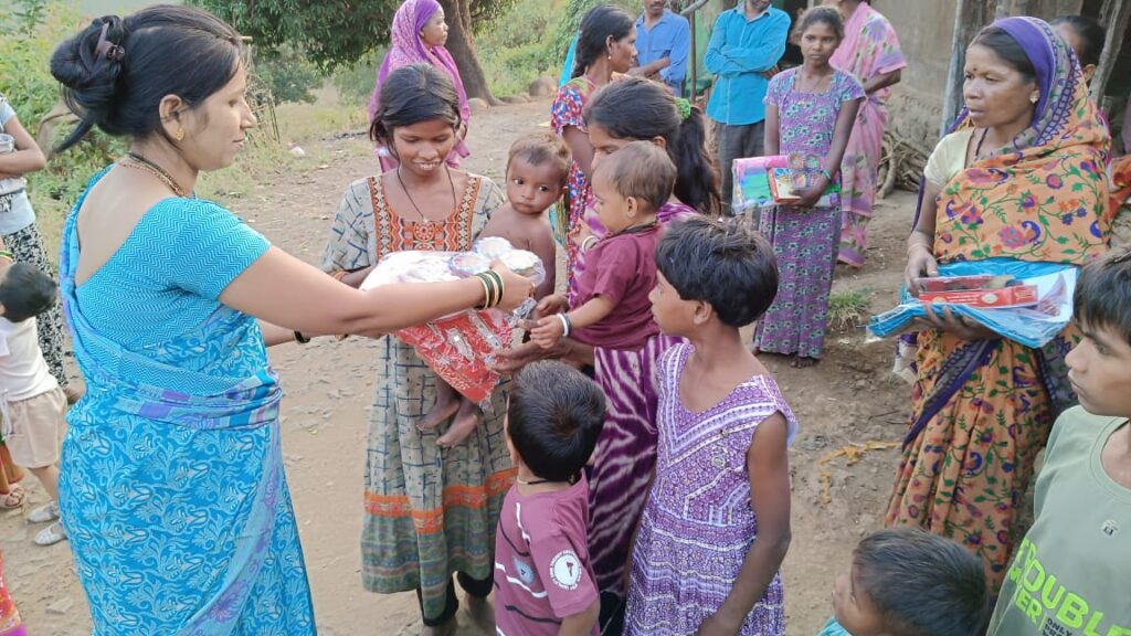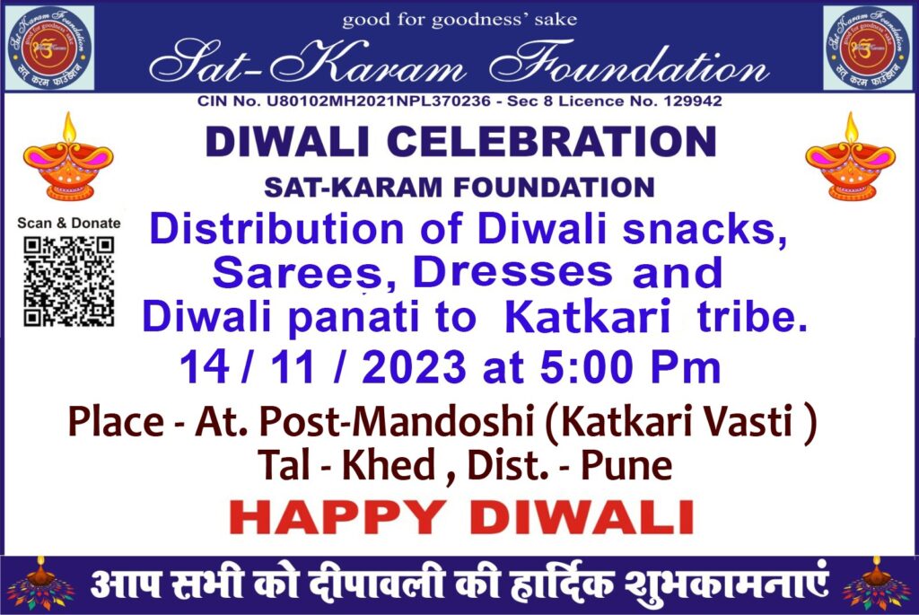 May 15, 2024 Events Comment off 14th Nov, 2023, on the occasion of Diwali, Sat-Karam Foundation donated Diwali Snacks, Sarees, new Dresses & Diyas to the Adivasi Tribe, At. Mandoshi, Tal. Rajgurunagar, Dist. Pune