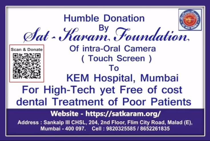 On 29th February, 2024, Sat-Karam Foundation team visited KEM Hospital and shared Intra Oral camera with their dental department for dental treatment of Poor Patients…Dr. Nanda Pai, Head of Department and Dr. Prasad, Senior Dental Surgeon and their team members were present !!!