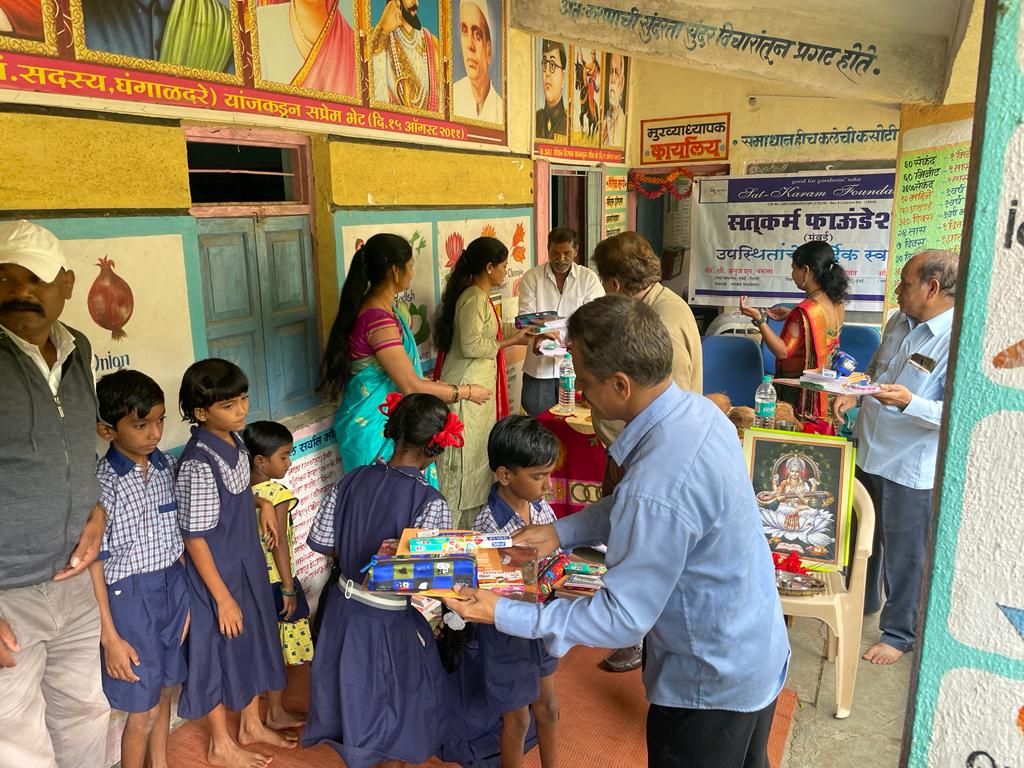 Sat-Karam has helped small schools in slums and Adivasi villages to expand by adding additional classrooms and providing fans, tube-lights and other paraphernalia for setting up classrooms. Sat-Karam has shared raw-material for the purpose of making various incense sticks (Agarbattis) etc. with visually impaired people by associating with another NGO/Organisation namely – “The National Federation of Visually Impaired Persons” at Village-Vangani, Taluka-Ambernath, Dist.- Thane. Sat-Karam has associated itself with Food distribution amongst poor children and pavement dwellers by participating in the food program “The Khilao Initiative” started by “The Health for You Foundation”. Sat-Karam has shared Raincoats and Umbrellas with poor students in 7 Adivasi Schools of Villages- Pimplachiwadi (Taluka- Ambegaon), Valmik Wadi, Sayarkhala, Gadekarwadi at Post- Gohekurd, Village- Pokhri, Taluka- Ambegaon, Pune, during the monsoon of 2022.