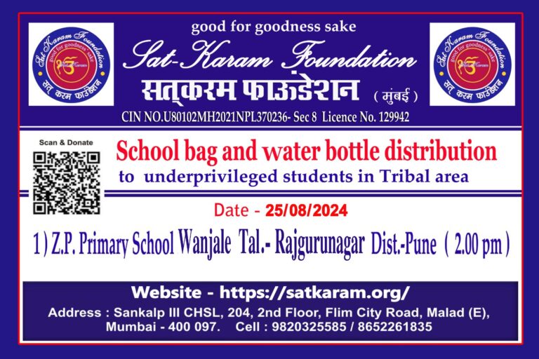 February 21, 2025 Events Comment off On 25th August, 2024, Sat-Karam Foundation donated School bag & Water bottle to underprivileged Students in Z P School, Wanjale, Taluka. Rajgurunagar, Dist.Pune. (25th August, 2025)