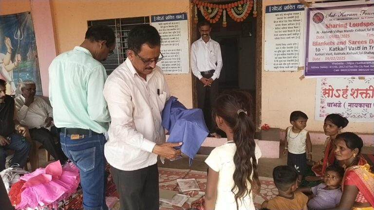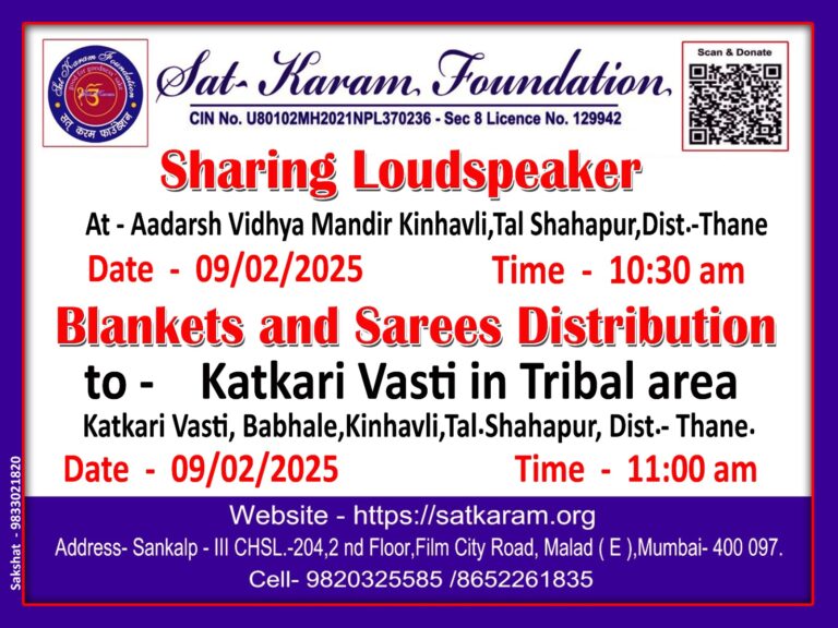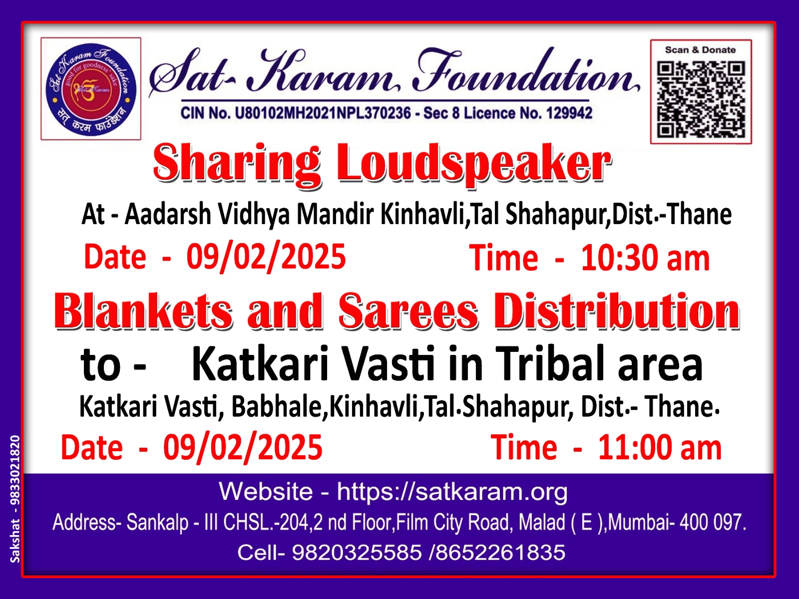 May 14, 2025 Events Comment off On 9th February 2025, Sat-Karam Foundation donated Loudspeaker to Aadarsh Vidyamandir, Kinhavli & Blankets & Sarees to Katkari Vasti in Tribal area at Babhale, Kinhavli, Tal. Shahapur, Dist. Thane.