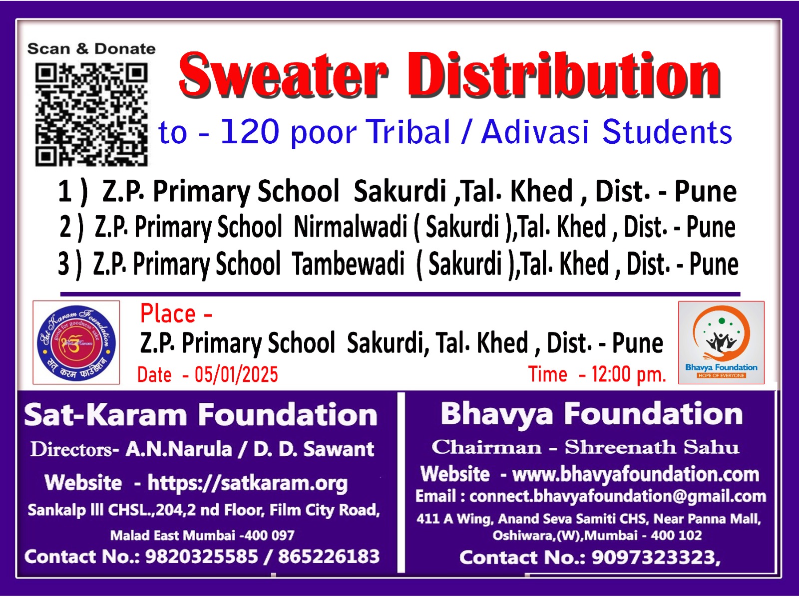 On 5th January 2025, Sat-Karam Foundation distributed Sweaters to 120 poor Tribal/Adivasi Students of Z P Primary Schools, Sakurdi, Nirmalwadi & Tambewadi of Tal. Khed, Dist. Pune.