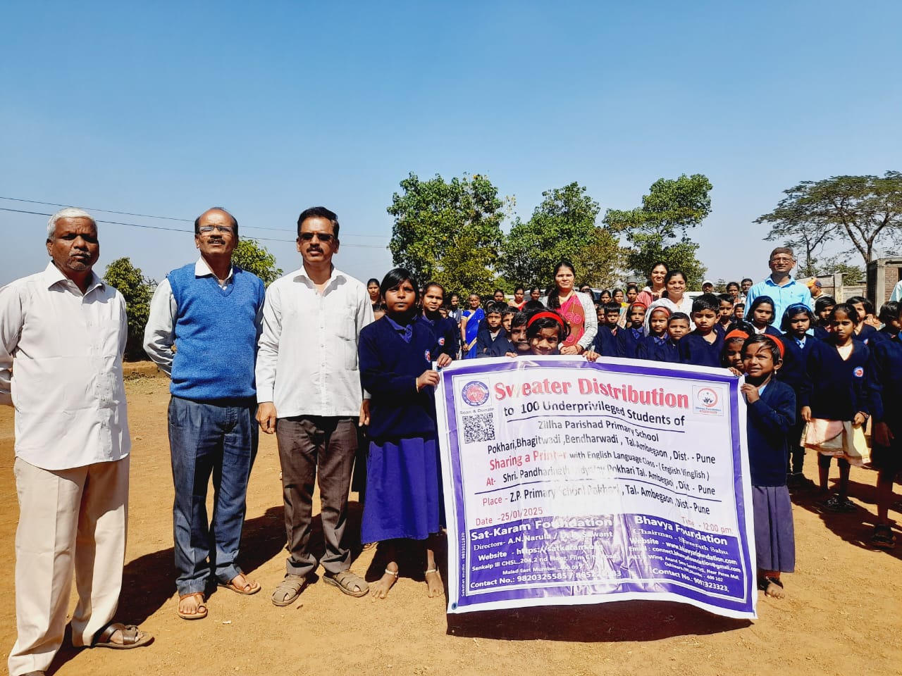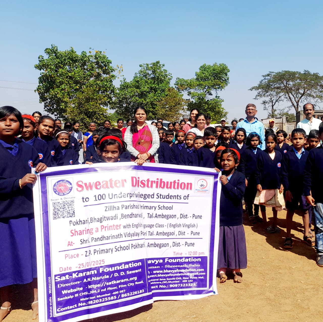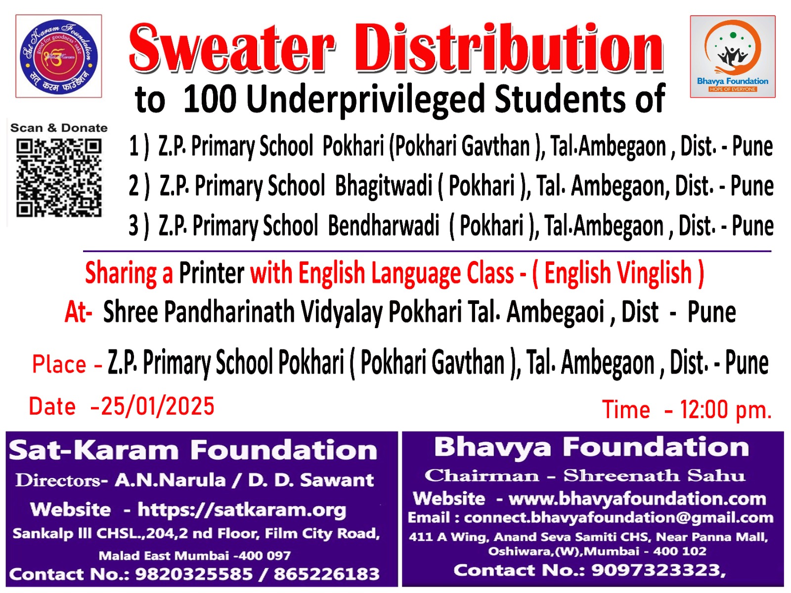 On 25th January 2025, Sat-Karam Foundation donated Sweaters to 100 Underprivileged Students of Z P Primary Schools of Pokhari, Bhagitwadi, Bendharwadi of Tal. Ambegaon, Dist. Pune & Sharing a Printer With English Language Class (ENGLISH VINGLISH) at Pandharinath Vidyalaya Pokhari, Tal. Ambegaon, Dist. Pune.
